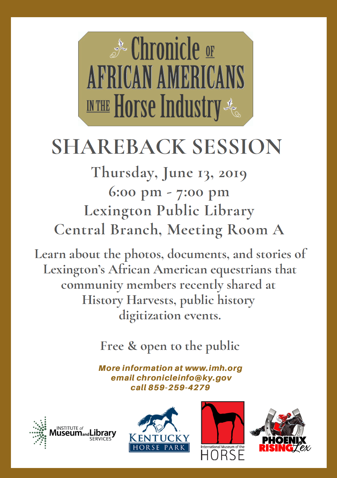 The International Museum of the Horse and the Chronicle of African Americans in the Horse Industry invites the interested public to a Shareback Session on Thursday, June 13, from 6–7pm in the Lexington Public Library, in Lexington, KY. This free presentation is a follow-up to their History Harvests events held in April and May, which invited people to share their stories and artifacts related to the history of African Americans in the horse industry. At the Shareback Session, organizers will share some of the discoveries, mementos, documents and stories that contributors brought. For more information about the History Harvests, see this blog post.